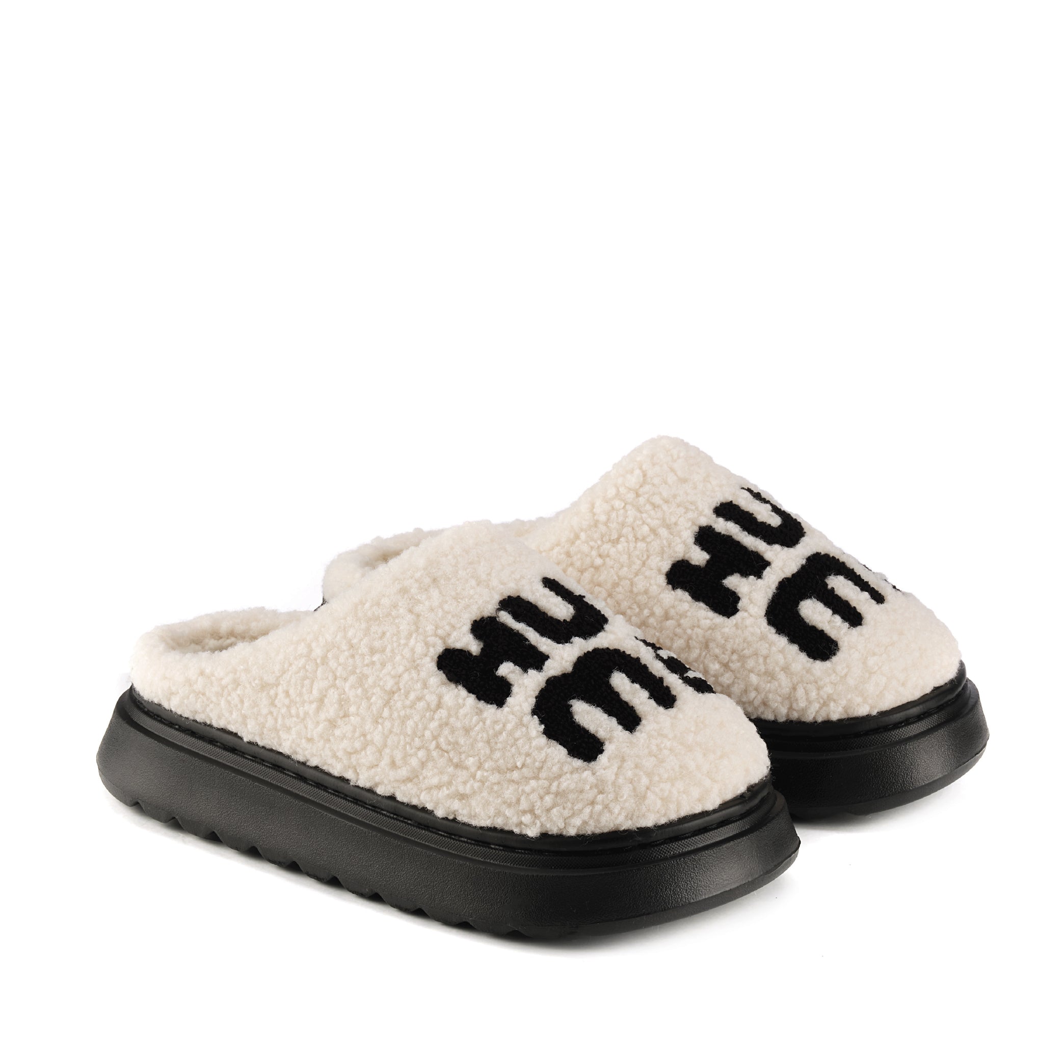 Ciabatte calde e confortevoli, fondo nero, sopra avorio con scritta.
